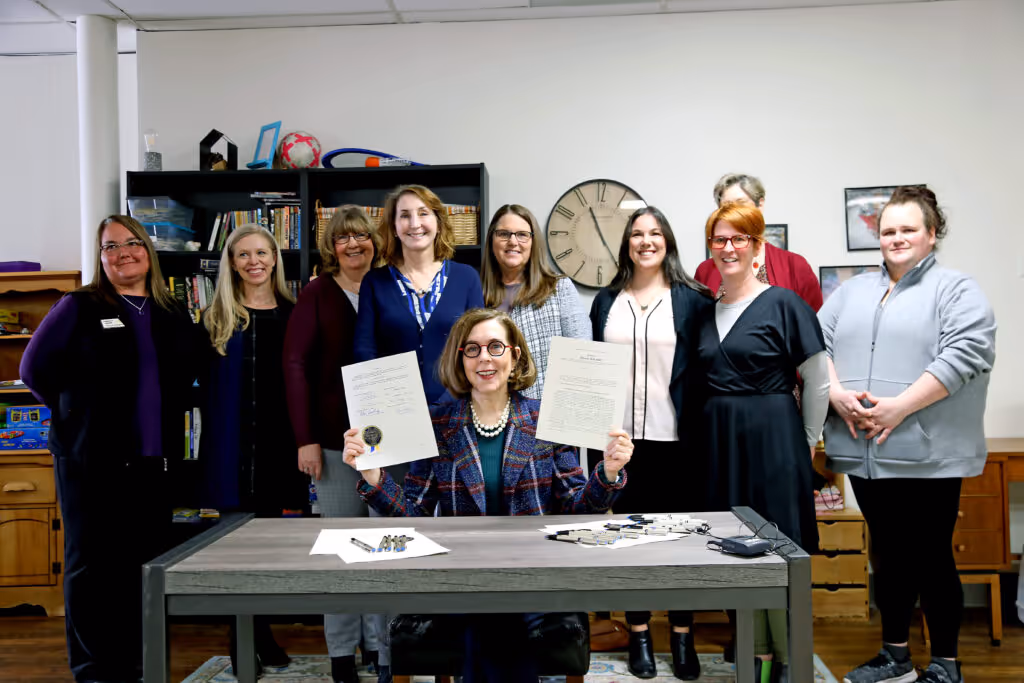 The Governor was joined by childcare providers, early learning advocates, Early Learning Division Director Alyssa Chatterjee, Senator Tim Knopp, and Representative Jason Kropf. The Governor also thanked the Children’s Institute, Family Forward Oregon, Oregon AFSCME, Imagine Black, Oregon Association for Education of Young Children, PCUN, Seeding Justice, Unite Oregon, and Euvalcree for their advocacy helping to pass HB 4005.