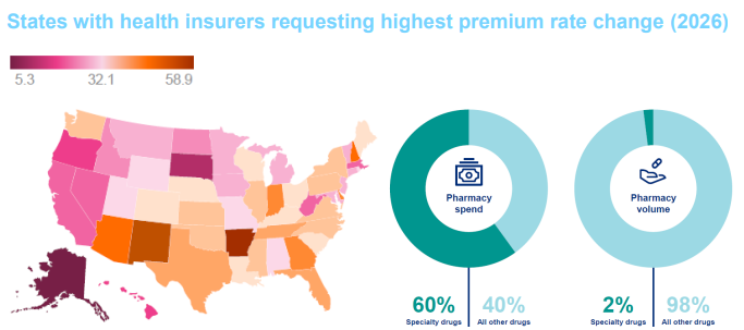 Health spending is up across medical and pharmacy lines; specialty drugs account for a large share of pharmacy dollars even though they’re a small share of prescriptions.