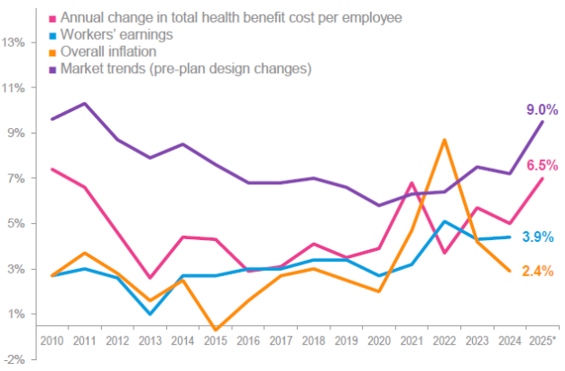 Annual changes in health benefit costs, workers’ earnings, inflation, and market trends (2010–2025)