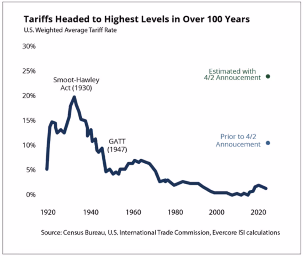 If the Trump administration’s tariff policy is fully enacted as proposed on April 2nd, the effective U.S. tariff rate is estimated to be around 25%, exceeding the levels of the Smoot-Hawley Act put in place nearly 100 years ago (see chart below). To further frame the severity of the proposed tariffs, research firm Strategas estimates the tariffs would generate around $620 billion in annual revenue (assuming no change in behavior) – nearly a $100 billion more than the U.S. Treasury received from corporate taxes last year.